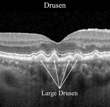 Dry AMD develops slowly. The retina shows small deposits called drusen. Vision may gradually become less sharp over years. Many patients live with mild dry AMD for a long time without major disability.
